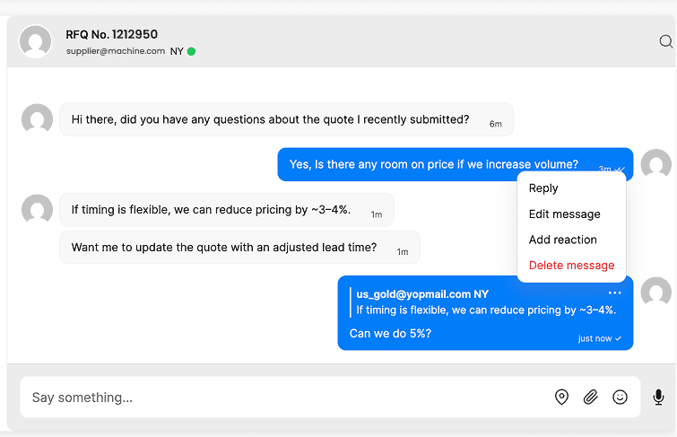 Compared to the previous experience, the new threaded system makes it much easier to maintain context over time—especially when multiple RFQs or conversations are happening at once. You can also react to specific messages to acknowledge updates or confirm details quickly.