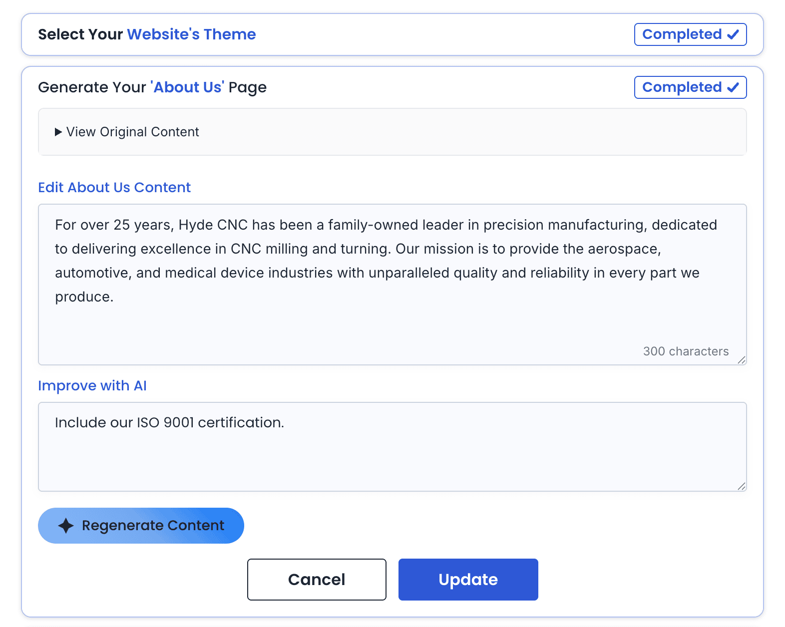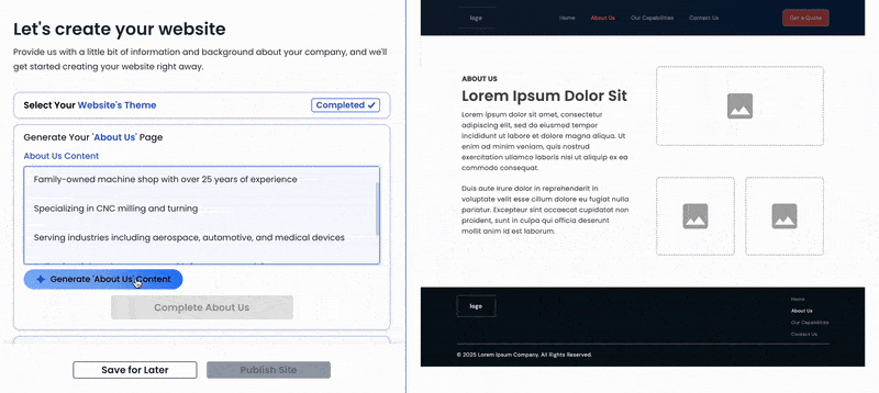 Enter your company details, choose a theme, and generate pages like About Us, Capabilities, and Contact Us. Upload your logo, photos, and see a live preview of your site as you build. Utilize our AI-assisted content tool to create clear, compelling messaging so your shop looks polished and professional from the start.